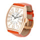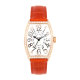 以独立设计师起家的品牌Franck Muller(法兰克穆勒)以前卫的创意与颠覆传统的时间阅读概念,成为被大多数人熟悉的知名腕表品牌。这款Franck Muller(法兰克穆勒) Curvex系列女士机械腕表用亮丽的橘色鳄鱼皮表带,搭配玫瑰金镶钻表壳,在雍容华贵中又不失青春活力。酒桶型的表盘极具创意,表盘周围的镶钻设计极尽奢华,彰显顶级腕表品牌的尊贵地位。白色的酒桶型表盘上镶有金色数字,表盘上方印有黑色Franck Muller(法兰克穆勒)LOGO,下侧为黑色Curvex系列标志。蓝宝石水晶精制而成的表镜精美结实耐磨,出色的防水功能,能够很好的延长手表的使用寿命。表底为密底设计。玫瑰金的针扣上也镶有密钻,在细节处体现尊贵。大胆亮丽的配色比较适合年轻女性。