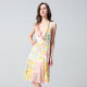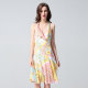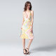 秉承了菲拉格慕华贵与优雅同存的设计之道,在2014年印花连衣裙成衣系列中仍然沿用了成熟与品味同重要的风格。设计师将大胆、复古的意式古典花样与100%桑蚕丝面料相结合,不仅延续了品牌一直贯彻的典雅,更让整体服饰充满活力与新鲜感。连衣裙光彩绚丽的色彩以及年轻化的款式在众多成品中脱颖而出。deepV设计与紧口底摆相辉映,设计感十足。这款大胆与创新的连衣裙是菲拉格慕打入年轻市场的主推款。而橘红、粉红色和黄色的软色调搭配,演绎出无限活力和清新。画龙点睛的深V领上图案也揉合了欧洲时尚的精髓,传递出时尚、神秘气息。手上可以搭配一款素色包包,会让整体的感觉更加清新、明快。