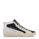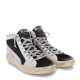 黑白两色真皮高帮休闲运动鞋,撞色拼片,圆头系带;鞋舌有logo补丁贴片,侧面是拉链紧合以及白色五角星贴片