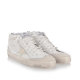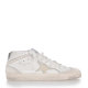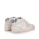 白色怀旧真皮运动鞋,马毛嵌片,圆头系带,布洛克细节处理,侧面星形补丁贴片, Logo鞋舌,商标后帮,橡胶平鞋底。